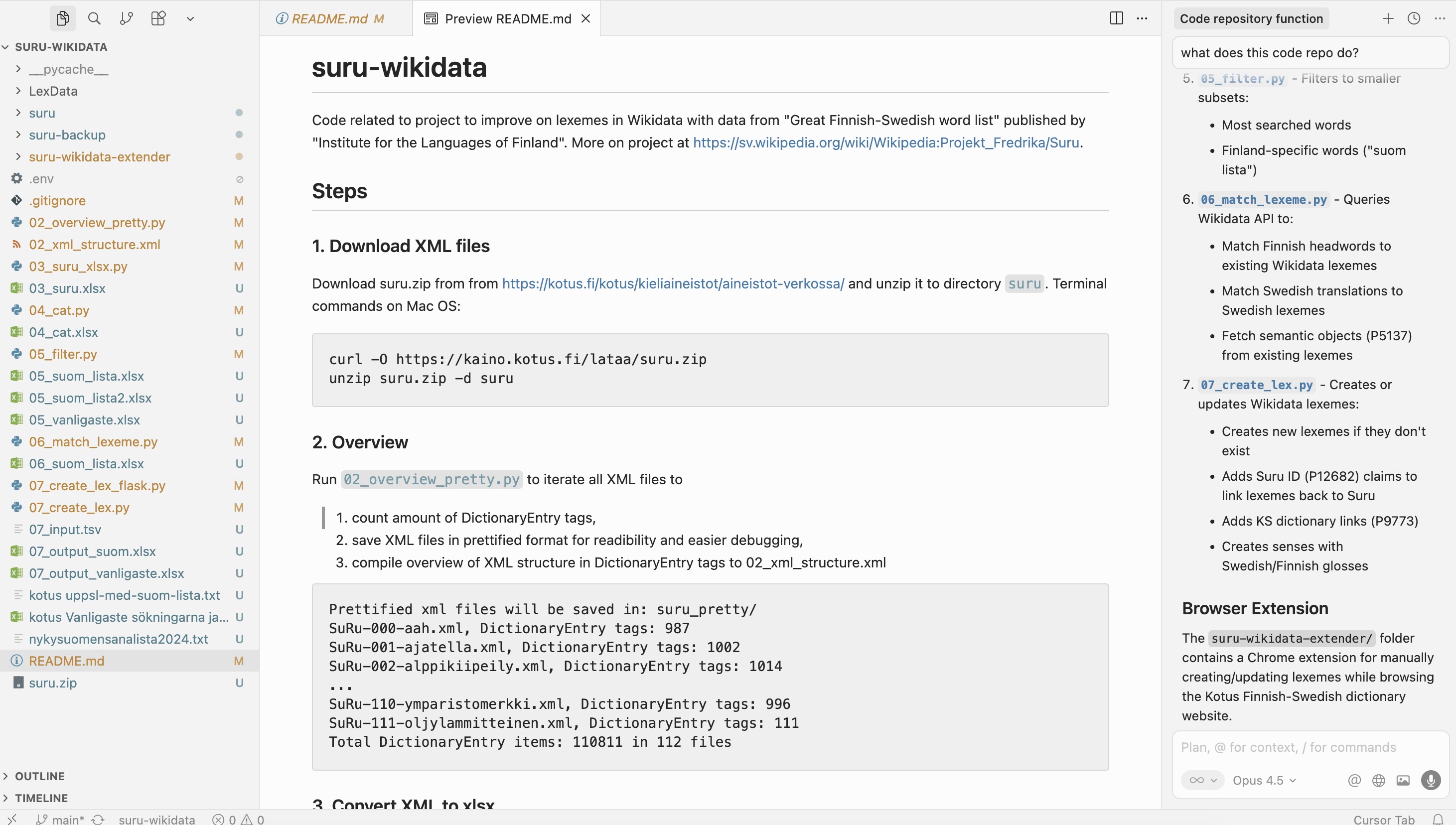 The Python scripts we created with Cursor to adapt SuRu’s XML files to Wikidata lexemes.