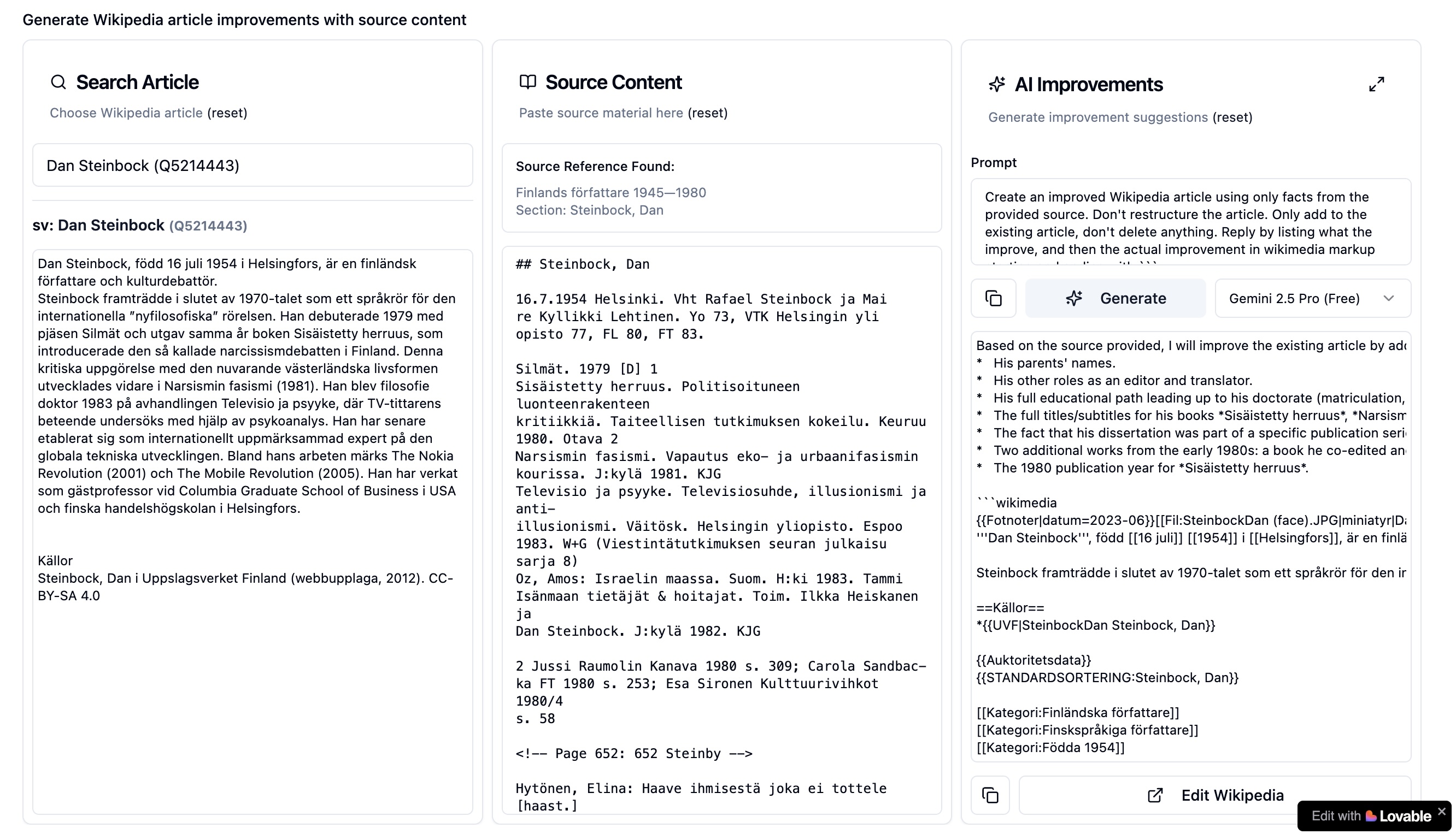 Lovable tool for generating improvement suggestions: current Wikipedia article on the left, source in the middle, and AI-generated improvement suggestion on the right.